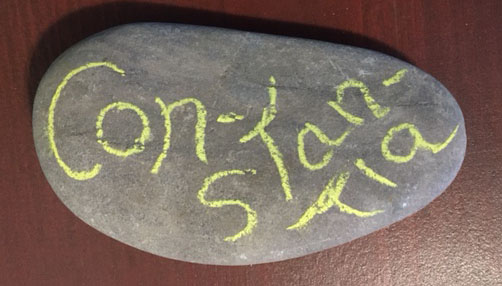 “May I see it?” He trudges to the bow and back with the rock. It is marked with letters. Nic may not pass a bishop’s penmanship standard on parchment, but on rock, it is clearly legible. I suppose the illiterate one is the head officer. In an exotic scrawl are the letters “C-o-n-s-t-a-n-t-i-a.”