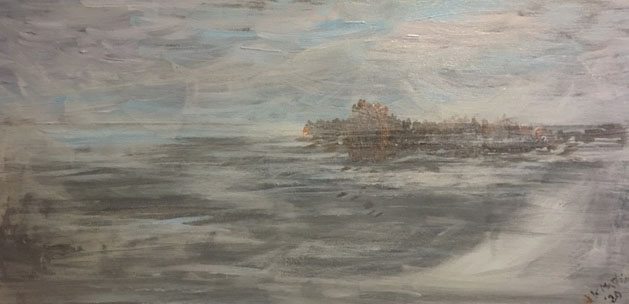 By midday the mist dissolves into light. Now visible is the shadow of shoreline so we set into a hard-row for the long hours of the lengthening day until the rocky shores we follow are nearly lost in the dark of night.