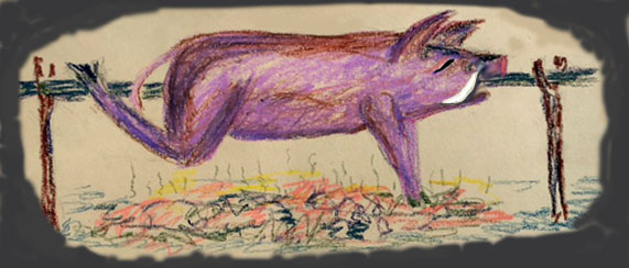 The pig on the spit looks familiar. Is this creature one-in-the-same as was choosing a rotted rutabaga instead of chomping into my nice and meaty man-foot just last month? [post #9.1] I think I’ll pass on the pork. Maybe it was my ancient Jewish upbringing but I’m not much for pork anyway. This is an abundant feast with fruits and cheese and bread. No one will leave hungry. So like the roasting boar himself, I bite into an apple. Our host notices.