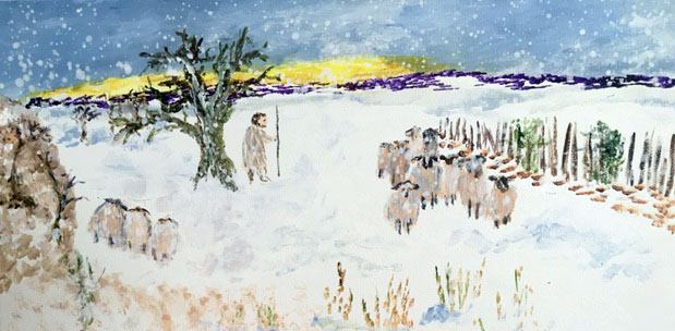This pasture is not just a random field; it’s the designated place the shepherd comes each night with these same sheep. Here, at the far end of the night pasture is a lean-to for shelter and he invites us under this thatch with room enough even for our animals to be safe from the storm; having them in here brings more warmth. The sheep cluster themselves against the wall of rock forming one barrier of this enclosure. Apparently the big white dog chooses to nestle in with the sheep rather than risk finding warmth with the man who has the rod. The shepherd explains the dog prefers the company of the sheep and the dog will stay awake all night and watch so even if the shepherd himself should fall asleep, the dog will bark if we were to steal a sheep and run off with it. In fact, we learn the dog will bark regardless.