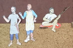 The shepherd rants. “My grandfather was a soldier just like you. He had a sword and a dagger! And just like you he was so fearsome he didn’t even carry a shield! He was always far away fighting in the wars killing off the Franks and Goths and the Romans by the wagon load, except when he came back and then his raging riles flailed a fierce rod on all of us. Everyone cleared far out of his way except my father stayed. He’s not a runner. So I came out here to mind the sheep until I learn to be a fighter too.”