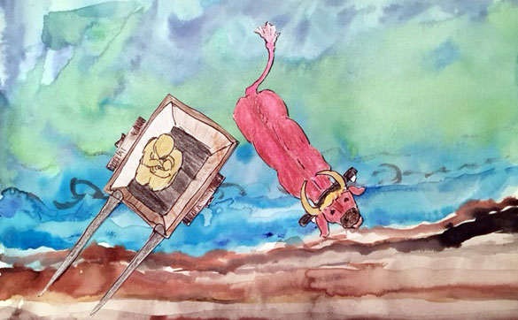 But in the torrents we find we are on the wrong side of the creek, and the swift flowing turbulence seems to worsen by the moment. So we choose to cross over while we can. The horses prance in two giant leaps, getting only our feet into the froth, but the ox and the cart are not so nimble. The ox is nearly mired in mud and the cart and the statue are caught in the turbulence pulling at the ox’s yoke. Quickly, August releases the yoke pins freeing the ox from the load, and leaving the three of us with all our strength to roll the cart onto the dry bank. Nic, then turns his attention to the panicked and bellowing ox sinking into the mud as August is swept away in this instant into the deepening flow midstream.