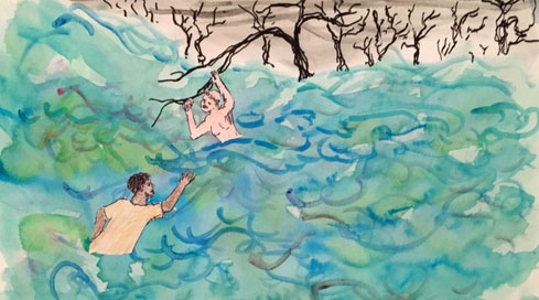 Caught in the current, the little monk, with all his strength is able to stop himself from the pull of raging river by grabbing onto a low tree branch rooted to the opposite bank. The ribbons he was wrapped in flow loose and twist and coil on with the fury. But the pale naked human form is clinging to the tree limb with quivering strength. I leave my cloak and horse and discover the icy water with the relentless power of current. The little monk has courage and fortitude enough to trust me and let go of the limb allowing me to take him with an arm around his neck to keep his head up, and together we float downstream as I can only make slow progress with swimming for the two of us in the raging water to reach the bank. Umber wanders near to where we land with my cloak still lain across his back.