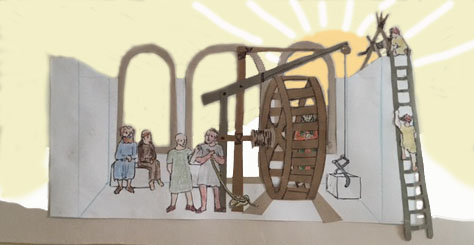 It is the full light of day and the workers have gathered at their places. I am in the wheel waiting the arrival of the other treadman. The ground crew has the steering ropes in hand; Shollo and Kairn are minding the crank handles guiding the ropes high on the wall stretching from the crane arm through the pullys and onto these newly placed tools. The mortar is spread; the stone is still on the ground but firmly grasped in the claw.