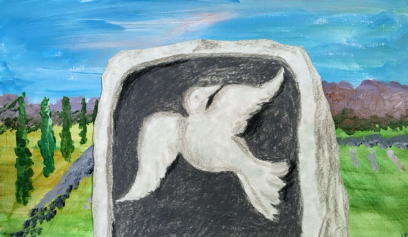 Brother August shows me a marker he made for Brother Joel. On this, Brother August has carved a bird in flight — soaring. It is a perfect image of this elder monk, since Brother Joel’s spirit was always gliding and soaring as a bird. But chiseled into a weighty earthen stone I can also recognize Brother Joel’s awkward paradox of earth and spirit.