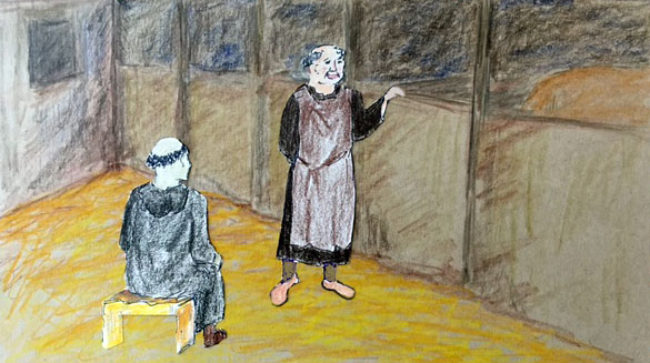 Now there is a stirring among the horses and the doves flap and fly immediately into the rafters. The stable master is at the doorway, surprised to see another monk here in his own assigned workplace.