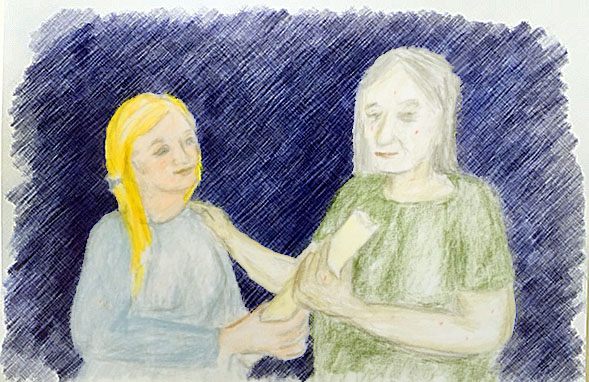 He goes on, “Eve adores that gift Anatase gave her that you helped in lettering when you first came here. Eve keeps her ‘precious pages’ next to the door and rubs her hands over the herbs often to ‘see’ through touch and smell what you and the apprentice wanted her to enjoy always. In the spring and fall seasons Eve and the young woman now, replace the dried leaves with the soft, fresh herbs so they never loose the fragrances and textures.”