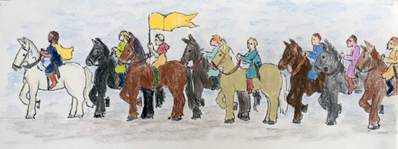 I’ve chosen not to carry a sword. I’m here simply to make the look of more men to gleam with the full awe of avengers riling with righteous rage for my daughter’s death. I offer to carry the banner. It’s a swath of yellow silk fabric leftover from making the count a new robe. He calls it the “golden flag.” I’m relegated to riding third in this fearsome line of raging young men. Daniel and the count go first. They lead because Daniel knows the way to the cooper where he met the pagan priest, and the count is nearer the front because he has a fancy white horse.