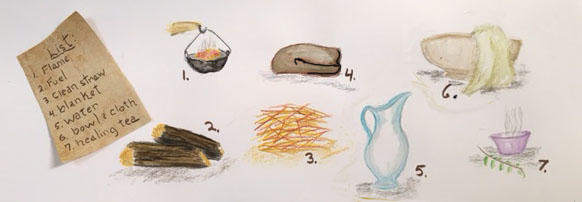 The first thing to do is ask the women who are chanting outside to provide things. I need some fuel and a flame to make a warming fire, and a blanket. Some clean straw would be helpful and a bowl of water and a cloth, and of course some of that healing tea that rescued the count.