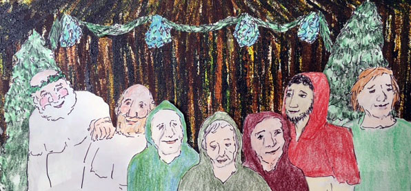 The divine law that rules is hospitality. Even a whole additional tribe, men and a few women and elders, along with the two of us all have places inside these thatch circles safe from the winter’s howl. And every cranny of unfilled space in any of these houses, from the slope above us under the roof to the seams at the door is filled with green bows of pine and bundles of mistletoe; everything is green and living even in this season when sacred trees stretch naked limbs.