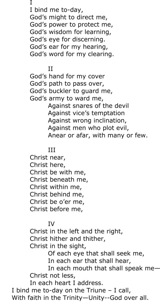 [Footnote][The Lorica, called the Faed Fiada, or Deer’s Cry* attributed to Patrick, for protection (Seumas MacManus, The Story of the Irish Race, 1921 Koneky & KoneckyOld Saybrook, CT (4th Rev. Ed.) p. 114. MacManus’s note regarding this English Translation – This Dr. Sigerson’s rendering of the hymn is in the same measure, metre and rhythm of the original.)]