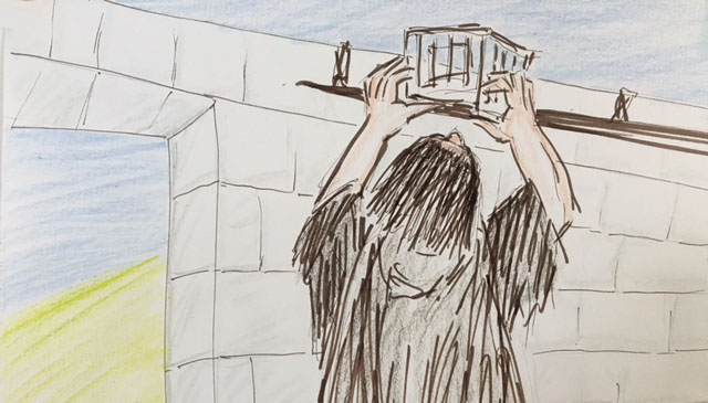 The servant monk comes on foot with a bag of things for Ana, and he puts the things she’s sending to Annegray into his bag. He takes the empty bird box down and replaces it with the bird he’s brought with him. He asks her something in a whisper she freely answers aloud.