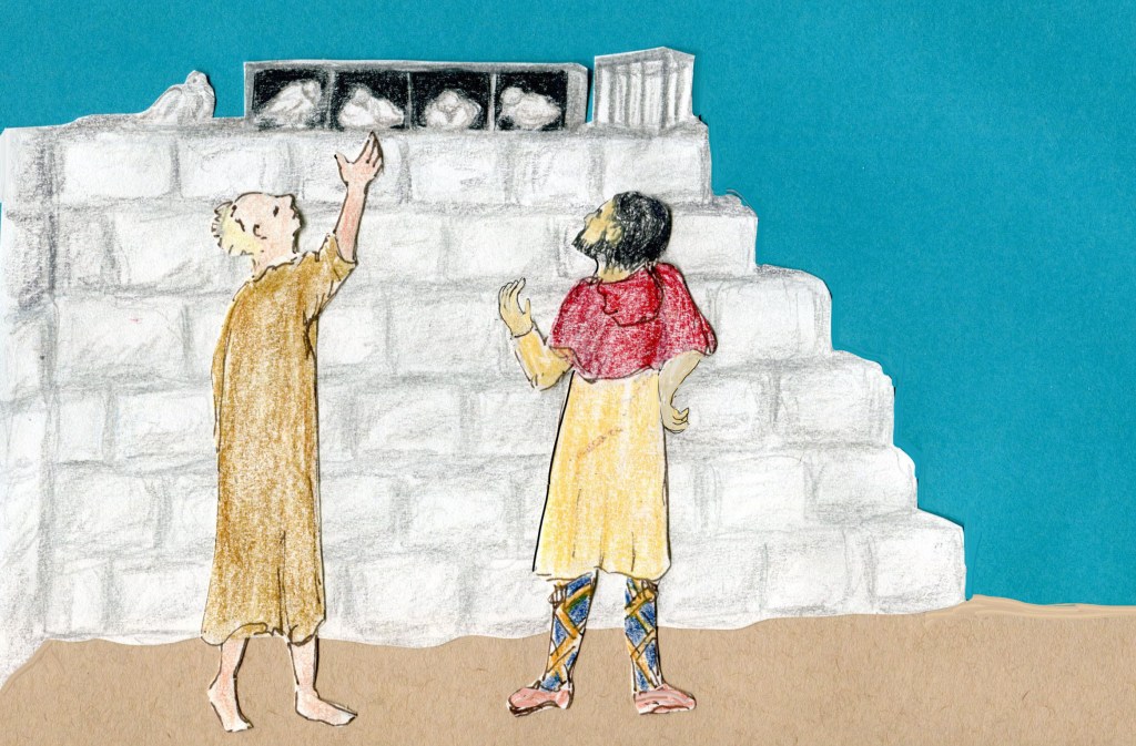 There is a monk tending the birds in this little room next to the oratorio. As a bird lands on a high rail this keeper of the birds takes it in his hand and removes the message, then places it into the aviary where it is safe from predators.