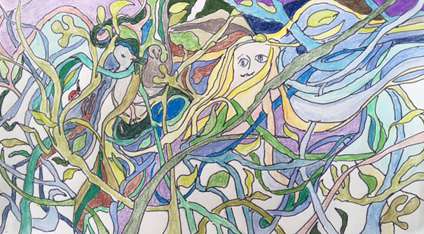 Now here on the banks of the creek as Brother Servant walks on I find all the materials anyone would need for cages and roofs, broom hedge for thatching and pine poles and hazel branches for building. He’s gone on ahead up the hill with the bird in the cage. The sun is rising higher, and already I’ve pruned a new hole in the brush for sunshine to pour through, and it makes blue sparkles of sky on the water, once dark. I have a heap of thatching cut here already.