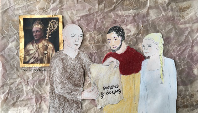 [Footnote 1] https://en.wikipedia.org/wiki/Felix_of_Burgundy retrieved 12-1-2022. It is an enigma for historians, but a fiction writer’s ‘ah-ha’ that Châlons of Burgundy, while missing a bishop, did have a “Felix” who showed up several decades later in Britain, as a bishop, then a saint, related to St. Columbanus. He was called Felix of Burgundy. (The bishop’s portrait copied into the art of this blog is from St. Peter, Mancroft, Norwich. posted in this wikipedia article noted.)