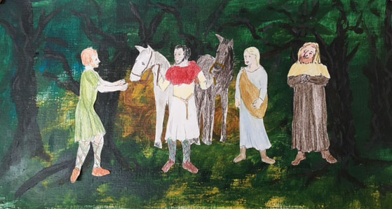 We’ve ridden most of the morning passed Tours, passed the ferry landing. On to the woodlands where the cooper makes barrels from the once sacred oaks now to fill with wine and ale. We walk the horses on the path into the woods to the village.