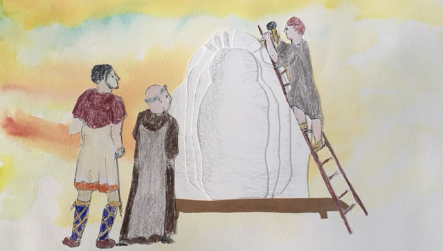 This morning after prayers and prayers again I find Brother August and his new apprentice at work on the great stone of marble. It’s in this state of creation where a halo is emerging from the center at the top, and it seems affixed to a head that is bowed. Already I can see Brother August’s artist’s eye has wandered from the standard. Art in a world where rule is rule and everything is either right or wrong there would be no nuance for a Virgin with a bowed head. In these times when original sin is sex which implies that sin pervades every birth except that of Jesus (and a Caesar or two claimed to have been birthed by virgins), it would seem to be the rule that such an otherworldly Virgin would have a gaze fixed on anything but the child.