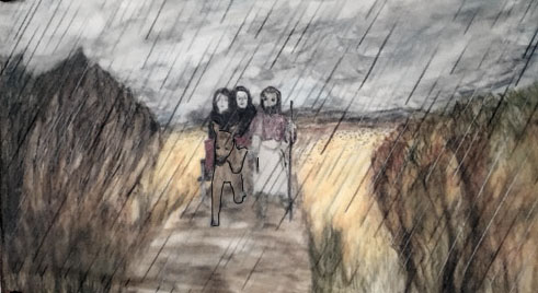 This cold October rain is relentless. Rivulets of gray water run in the ruts merging into the full river of roadway. The little donkey shakes his head to clear his eyes. I lead him walking, while the women spread the tarp over the cart for a bit of shelter for themselves.