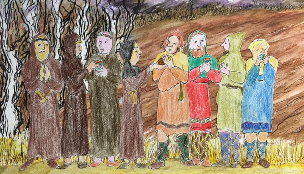 The nine of us men gather at this fire and pass around the pot of porridge the women have provided. The food is thinned out enough that everyone can dip a cup. The monks then consider the story they’ve heard of the feeding of the multitudes from the Gospel of John. That is unlike the other gospel’s stories of miraculous feedings by Jesus. In John, a child steps forward and offers his own little lunch, three loaves and two fishes, and somehow, by the holy sign of God’s love for all people, sharing makes the little become plenty. The sign is in the sharing. [John 6:1-14] Blessing the bread the monks have brought, and passing it, there is enough for everyone.