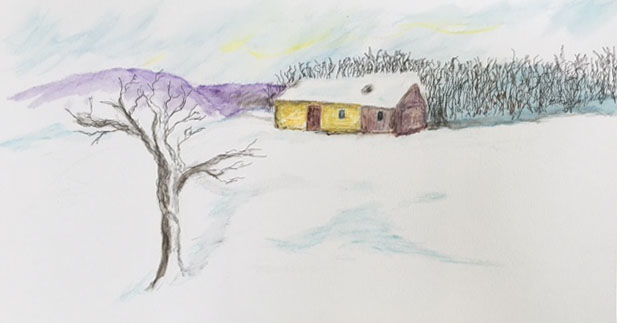 Now I wish Ana wasn’t hidden in the cart cover so she could see what I see. The rising sun has spread light beams on this hilltop glistening the snow. First we see our wheat field, a smooth place in all this whiteness with a few yellow stalks of straw leftover from the harvest. But it is a well-groomed field at rest for winter. Then, rising on the round of the hilltop, there is the cottage with the end a stable completed. It’s beautifully made with shaven boards and a fine thatched roof. No wonder Brother Servant came with us glowing as a gifter.
