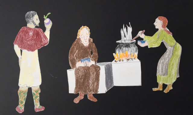 Brother Servant finds Colleen’s porridge delicious. But Ana suggests I do the cooking if Colleen doesn’t allow her out of bed to do it herself. I’m fine with that. Let’s let Ana rest. I think we can spare a turnip from the heap of roots, and Ana requests some. Oh, yes, and we still have the sacks of rooted herbs out in the cart. No one has to eat boring porridge.