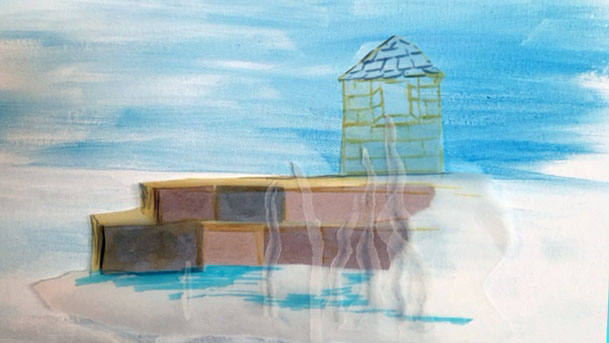 In my search for the warming fire I find something else. Where I expected to find the oratorio there is a blue lake within the walls under nothing but sky. The water is misting into the cold air making a fog over the waters. Some who see earth stuff as evil might curse this interface with warmth rising up from the underworld, seeing it as proof that the core of earth is Hell. But in my opinion, as a constant witness to the beauty of Creation, I simply say thank you God; it’s beautiful and warm.