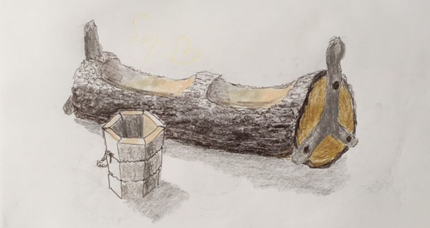 After our midday meal Brother Servant is on his way taking a bird, and leaving the two nuns here with Colleen and Ana. I find that this is a good time to work alone in the stable to hone my winter projects, the cradle for two, and an oaken churn. I’ve already completed the bucket for milking, and Colleen has been using it for a few weeks now. And I happened to find a fallen forked branch about that time also that I shaved and shaped into a fine one-legged milking stool for her. So at least Colleen finds me useful as a carpenter.