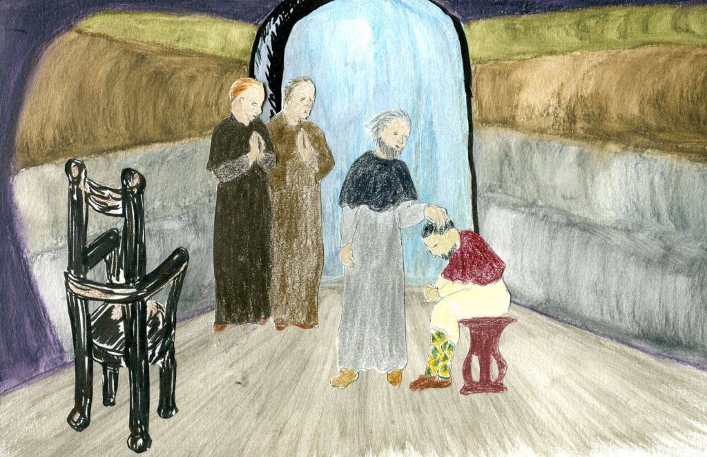 I’m telling the Father of the brutality in Châlons and my rescue by Gabe and Greg. Ana is well-known for her gift of healing so they shouldn’t be surprised that I’m not dead, but healing. Brother Servant brings me a chair.