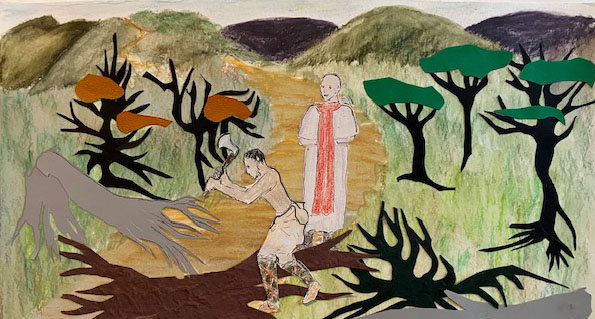 I was cutting wood here on the solitary path to Annegray, and here is a man in the robes of a bishop walking this path alone.
