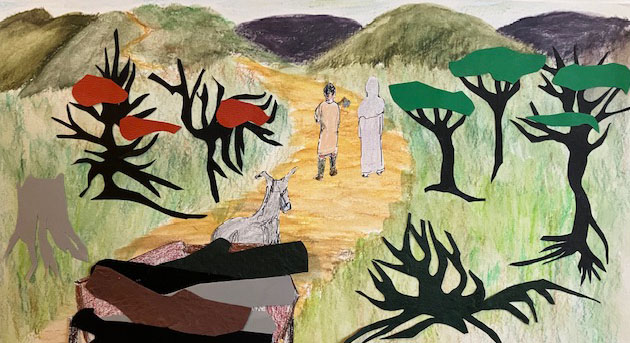 We are walking up the hill to our cottage — an elegant bishop in fine, flowing robes, a swarthy woodcutter, a mule and a wagon full of hewn logs.