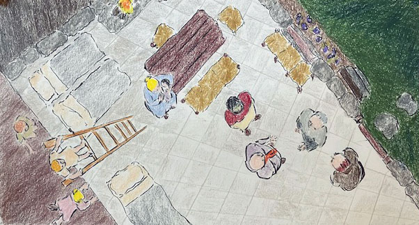 Now Ana and I prepare straw beds for three guests in the main room. The children are amazed to find that all three of these visitors already know the vesper psalms we sing in this household each evening. I suppose my children thought this music was theirs alone. Now they assume these adults are singing children’s chants.