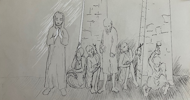There is no answer, even from the grunting fellow. And it is obvious from the stench that they aren’t released for their personal needs. No wonder the guard waits above on the main level. And I’m glad to find the Father is not chained in this predicament also.