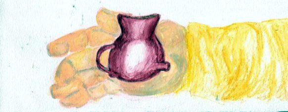 He is looking through the family treasures in the cart, the cradle and the blanket … and what is this little jar?