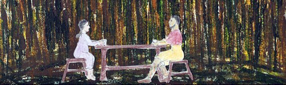 Today I return the empty donkey cart to the farm shed at home, and walk on to that little thatched house of secrets behind the church in the woods. Gaia has no idea there is a house for her. And now Ana and her daughters have brought all the things of home into this place. Brandell comes up every chance he gets, always imagining Gaia’s surprise when she follows the yarn that she herself strung through the wood to border the dancing space. And when her fingers lead her to this place where she will expect her guests to be waiting for her, instead, here will be a house, now with a proper table, and a bed and a bench.