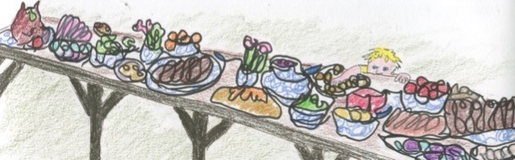 Everyone is buzzing around her, adding flowers for her hair, and chains of daisies around her neck; she is surely the queen bee of the garden and yet she is busy with considerations sending Hannah off with the donkey cart to the castle serf fields for Will and Layla and the baby. And now the cart is coming back up the creek path, followed by a line of peasants who just want to dance again to Brandell’s songs.