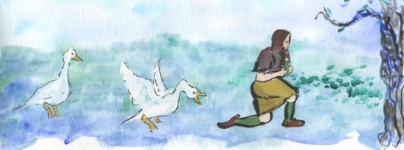 I was hoping all that is needed are flowers and some tea, but here I am again in this herb garden where the white geese keep the weeds at bay. The gander declares me an intruder and comes at me clicking and honking, tall and arched necked, so now all the geese are chasing me around the garden. I hold my hand out to them in a gifting manner and it gets a raw pecking. I try speaking in a soothing tone, but hearing my own voice through my empathetic goose ears, I must sound like a snarling bear. It is no wonder they whip the stems I’ve gathered and fling them hither and thither.