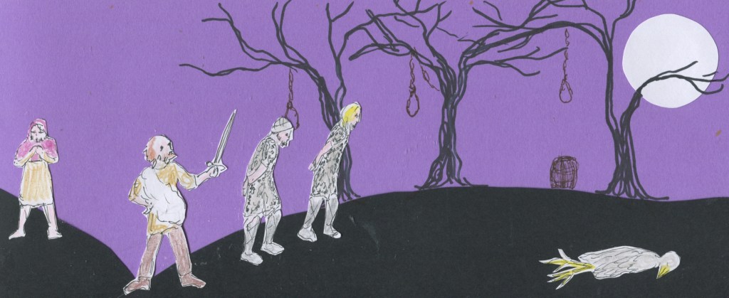 They can see I have nothing to rob. I’m sure they already have Gaillard’s bag of the king’s gold, so this probably isn’t about gold. Now I see. They have Greg and Gaillard captured and are preparing ropes in the tree limbs. The earth was already wounded with a gapping pit to receive our deaths. This is not something easily solved by handing over the King’s gold. There is a rope around my neck now. I see on the ground in front of Greg and Gaillard is that last bird they sent, dead, and nearly plucked clean of its feathers. It was intended to warn the Franks of the dangers from the north. Greg calls me his brother and begs for my life. He says I know nothing at all, and his “brother” should be released.