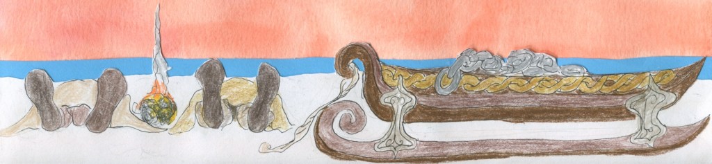Sheltered here in the deer skin, I am snoozing when the sleety rain awakens the marauders. They are roaring curses in a language of words I don’t know, but curses are recognizable in any language. They are already bad tempered. What will they do when they find their heavy chain has been set free of me?