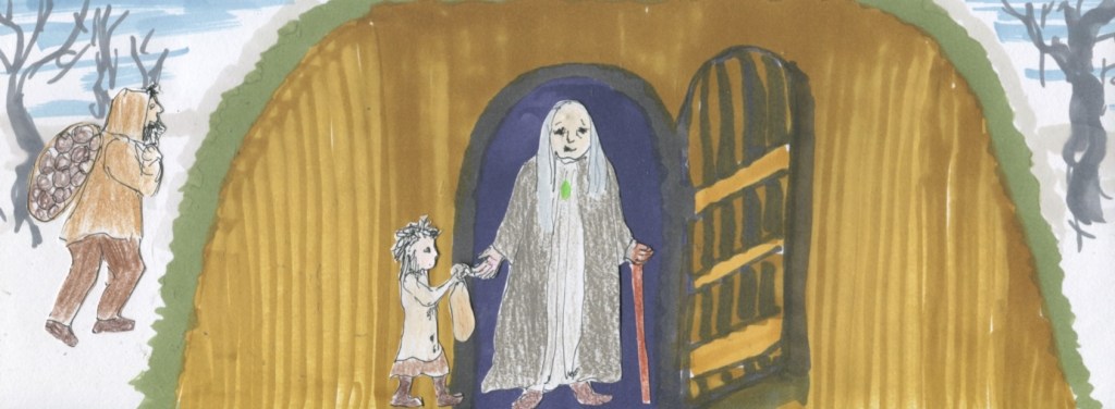 The seiðr answers the door seeming more haggard than at the feast last night. She isn’t animated by story. Her long silver locks are laying limp and her dress is uncinched, spreading wide and free, but also, large and unkempt. She lives in a house with lots of others, and it has the fragrance of mint tea, boiled dry, burned in an iron pot. She tells me where to put the wood and takes the wineskin from Marian, thanking the child profusely as she guzzles a good swell, then hangs the satchel of drink carefully next to one of the cloaks and her walking stick.