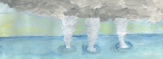 As I sit here and gaze across the waters toward the west, where water spouts are rising up, and dancing on the surface of the sea – signs of something – maybe it is fearsome waters. Do the monks on an island, said to be unprotected by soldiers, see these same signs? And who is reading the signs: the roaring winds; the thunder with lightning flashes with yet no rain? So many omens filling the skies and now these mindless fingers of wind over the waters, pointing to the whirlpools, dropping from the storm clouds swishing the surface of a placid sea. With awe we all watch these warning signs and no one knows the meaning of it.