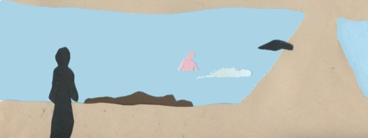 As the sandy plain dampens in the returning tide we realize another drown man, still fully clothed as a monk is lying on the sand bed.