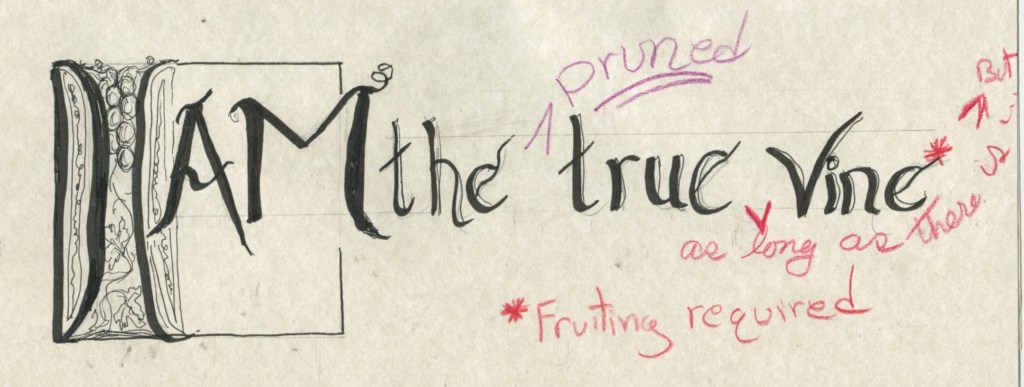 Somewhere the words of God’s love for everyone, when Jesus speaks of a vine that connects all people as part of the vine of God’s love, comes with the weight of human requirements on our own earthly selves. Fruitfulness hangs heavy in the Jesus words.