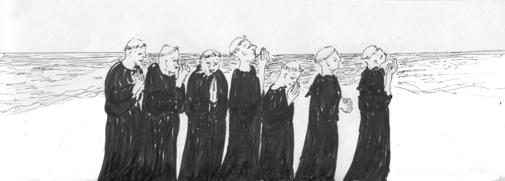 As a dark-clothed mourners, all of us on this island, move as a group from the burial places to the priory. This oratorio is bleak appropriately matching the hollowness in everyone’s hearts. There are no golden sconces on the walls, and the tables that held the reliquaries are stripped clean of cloth and purpose. The golden boxes are gone. I won’t tell them that I witnessed sacred bones and saintly relics discarded in the beach grass. Knowing that can only transfigure the marauders’ disregard for Christian tradition into more hate. I’ve already gone to that eastern beach, unnoticed by Brother Ealdwin, and gathered up what I could find, then I, alone, buried the discarded relics to lie with the saints properly venerated in the cemetery.[Footnote]