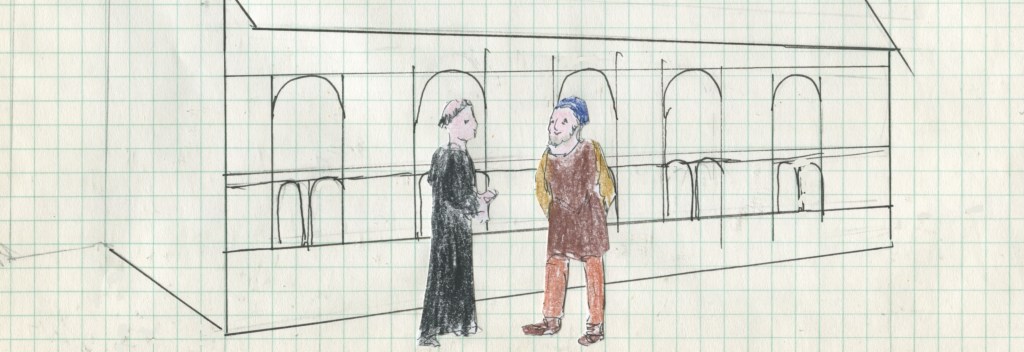 He directs me to Odo’s house. I see here old Greek notions for buildings are remembered. It is created first, not of stone and mud, but in the imagination of a mathematician, as a drawing on parchment. And that seems to be the function of Odo’s workplace where I wait for him. Here is not one stone or chisel, but rulers and inks. The worktable is spread with parchment. The book stand is overflowing with ledgers and maps. And here is Odo in a builder’s leather apron, but a demeanor clothed in the finery of a nobleman.