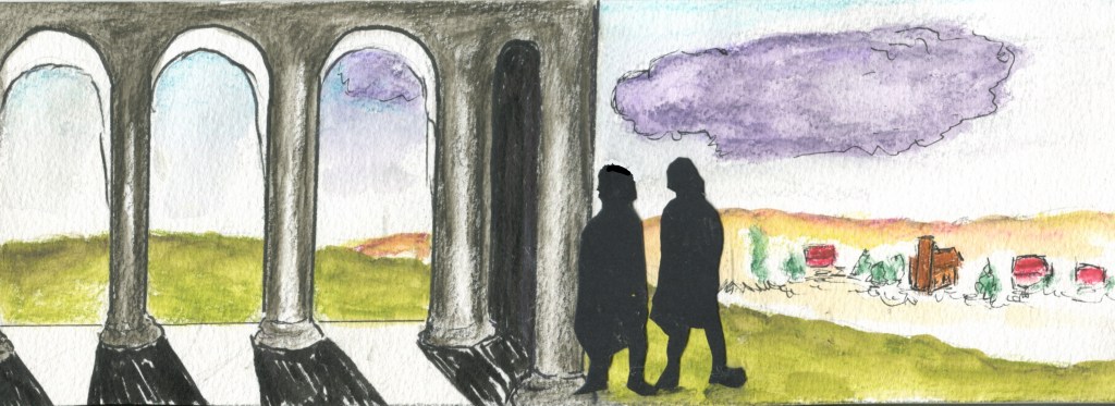 The baker and I are waiting in a monk’s chapel near the river, with the monastery gardens all around. Just beyond the wall is the place where the grasses grow and grains are harvested.