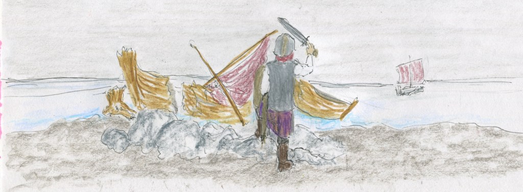 These prisoners are bound and waiting with the beached longboats. Ousbert’s soldiers disarm the dead, collecting up the swords and shields, stripping the bodies of helmets and chains. Then the last living dregs of these marauders are set loose to dispose of the corpses at sea.